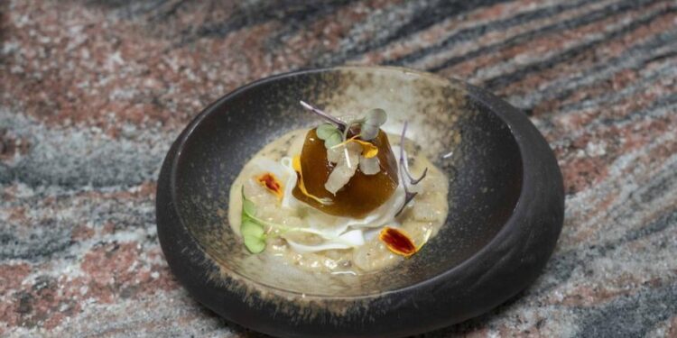 Así, podemos colocar el cuello del plato en tres capas: carbonara en la base, calamar en la siguiente capa, pato en la parte superior, y daikon en piezas para finalizar.