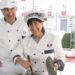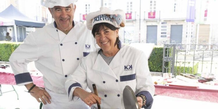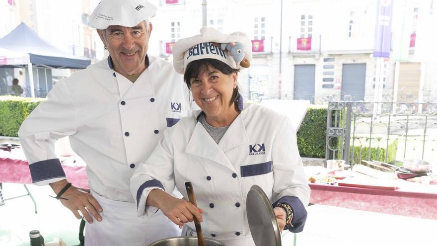 Bernar, presidente de las asociaciones gastronómicas, añade harina de vino blanco para la salsa mientras la sofríe y la pasa por el kitxer.